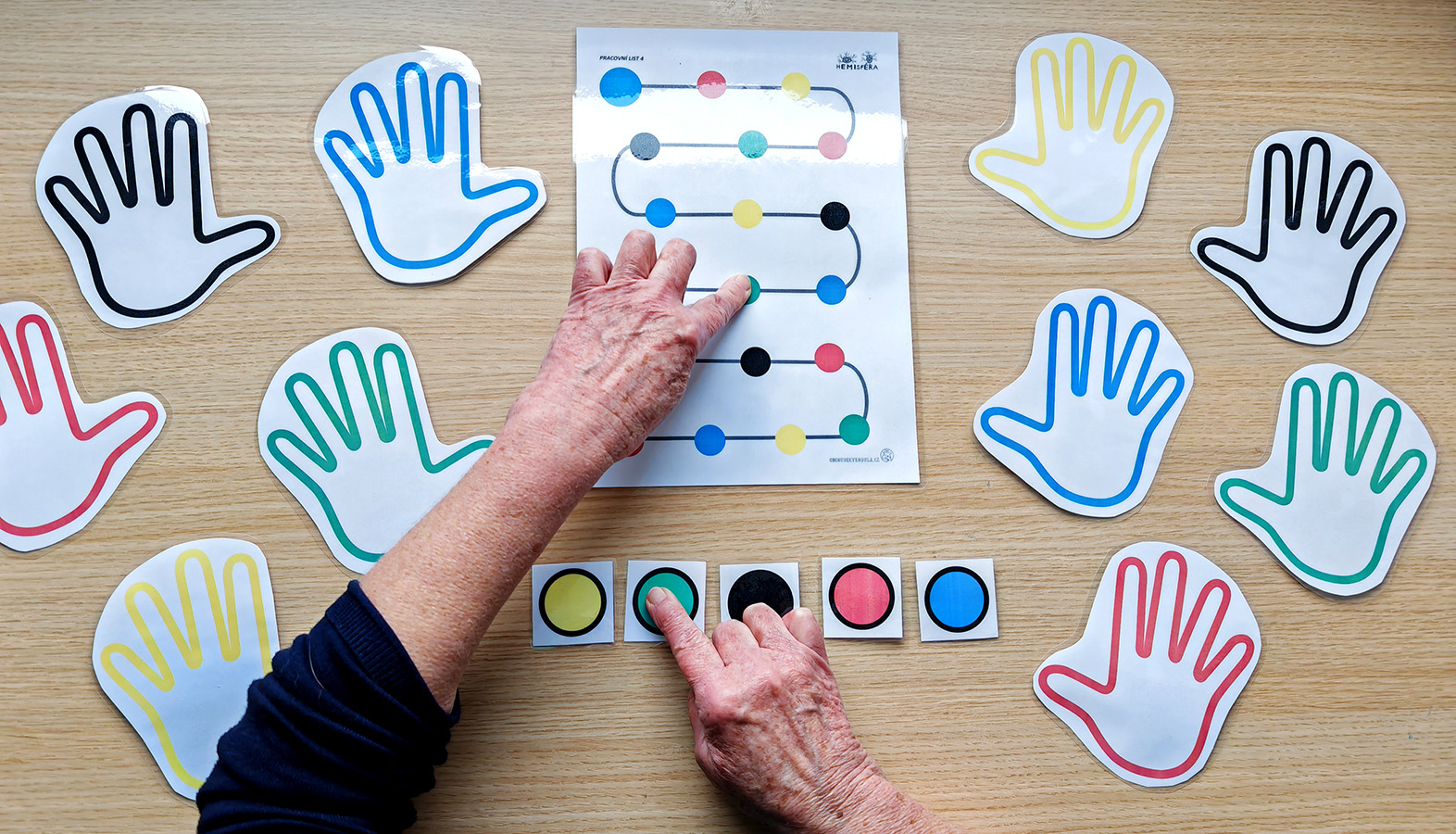 Vystřihnete si obrázky dlaní, barevných koleček a podkladové pracovní listy pro nácvik.